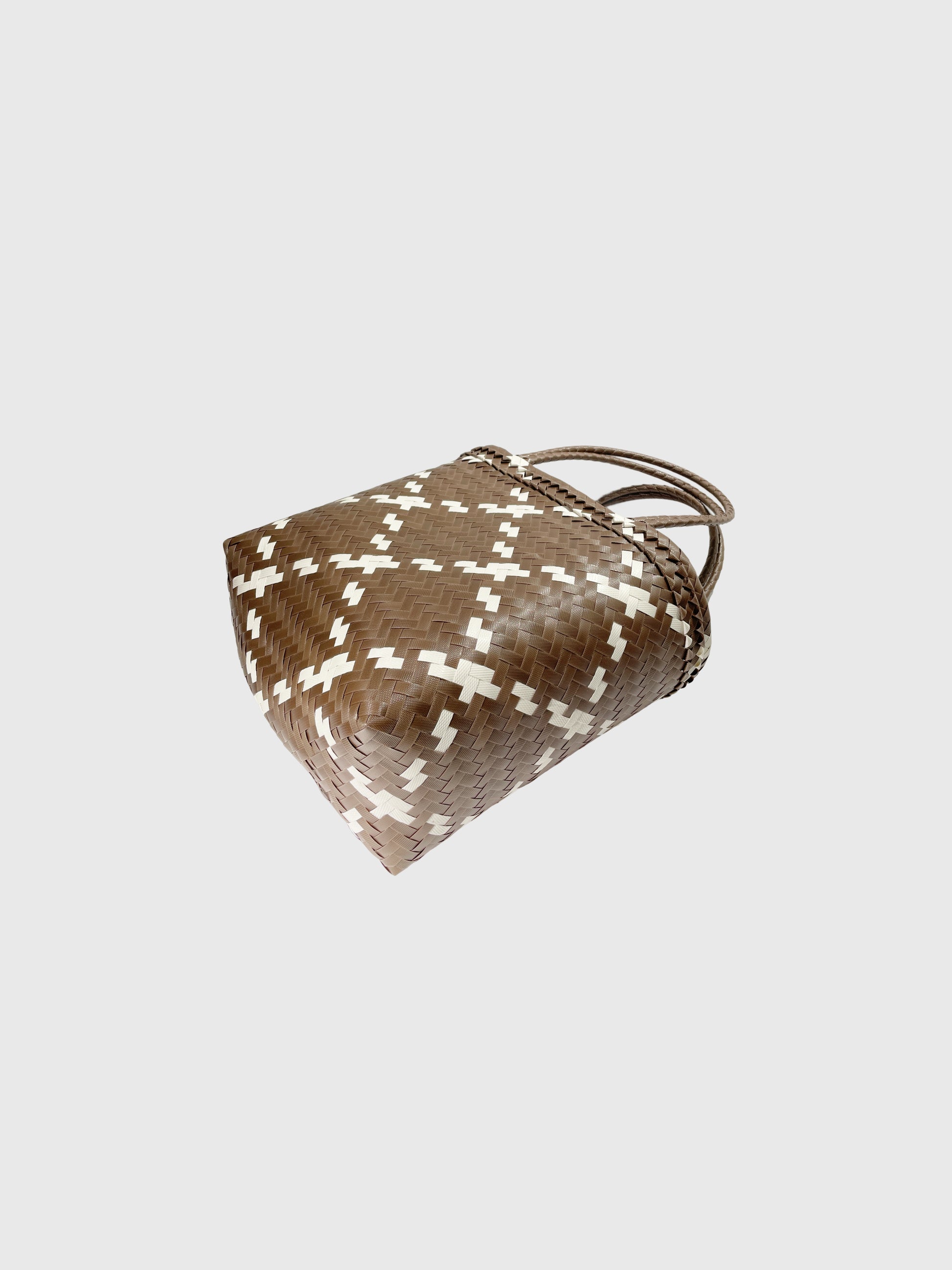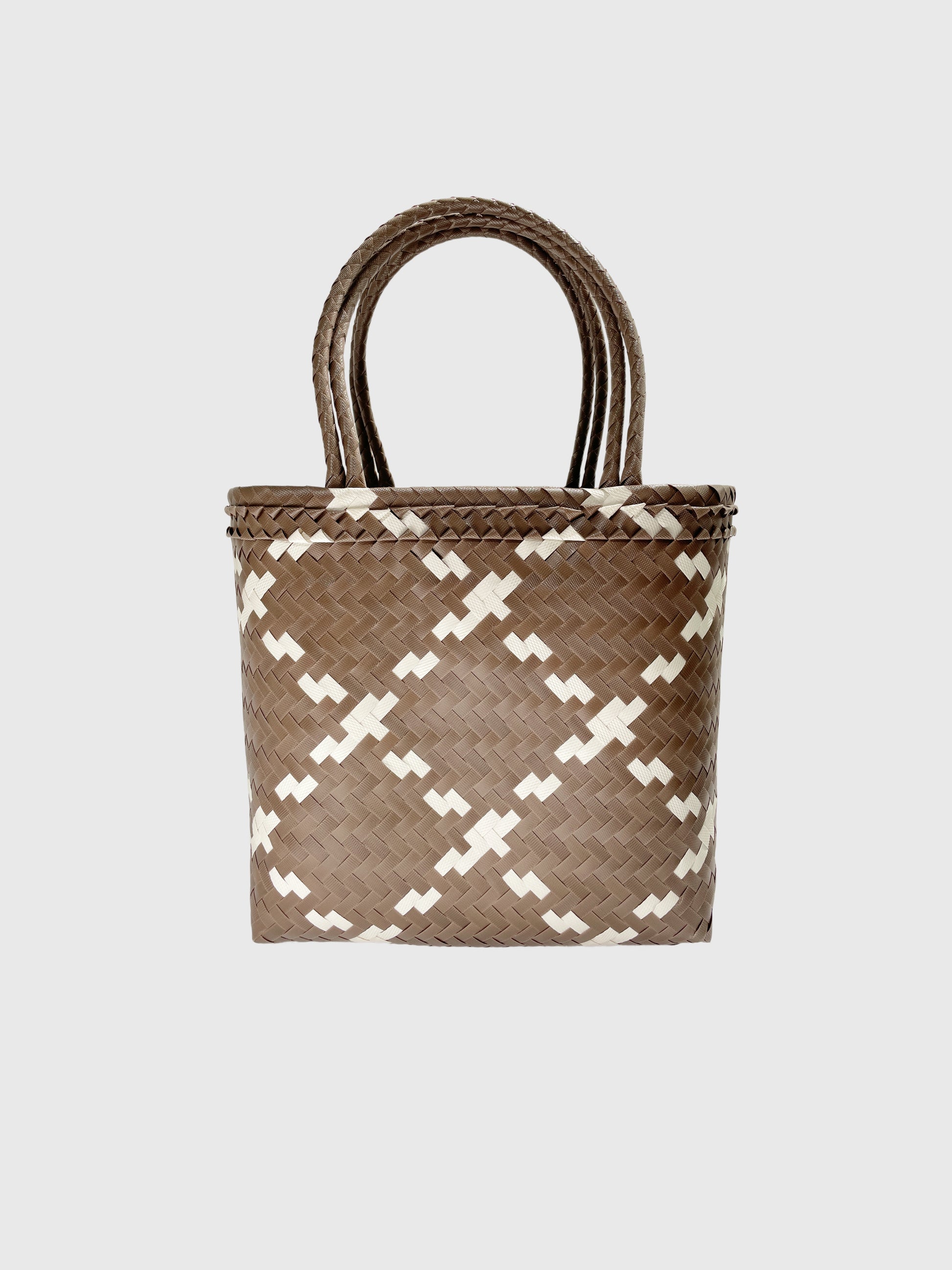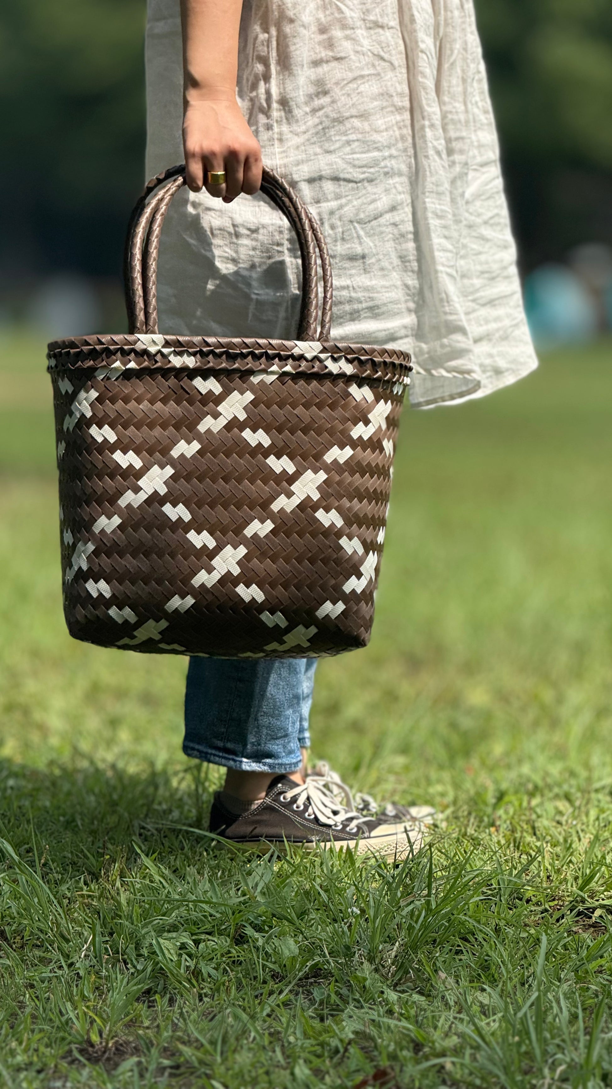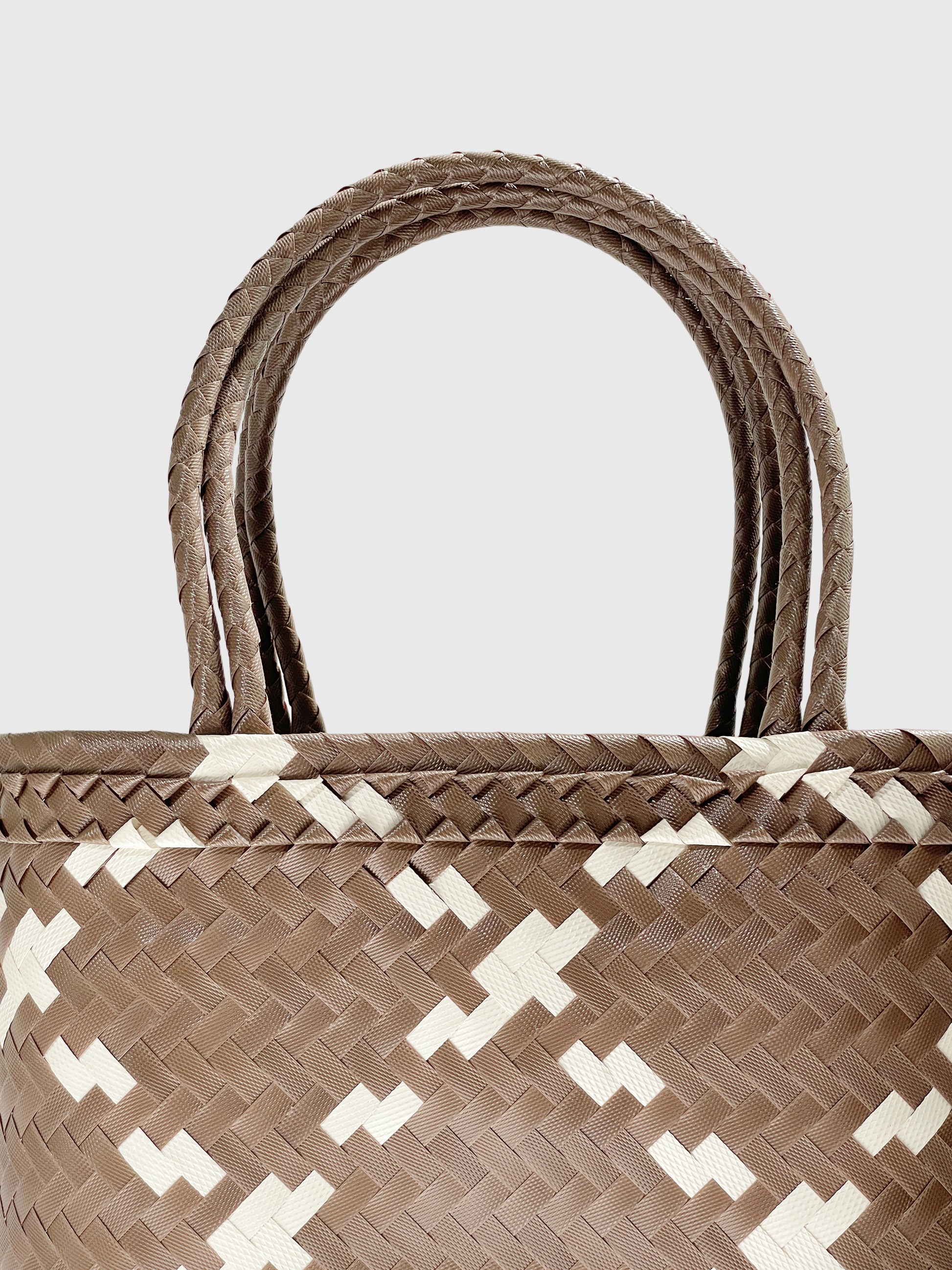 深みのあるチョコレートブラウンに、ミルクのようなやさしいホワイトで格子模様を施した上品なデザイン。シンプルながらも存在感があり、ナチュラルさとクラシックさを兼ね備えています。大人の女性のコーディネートに自然に馴染むカラーリングです。