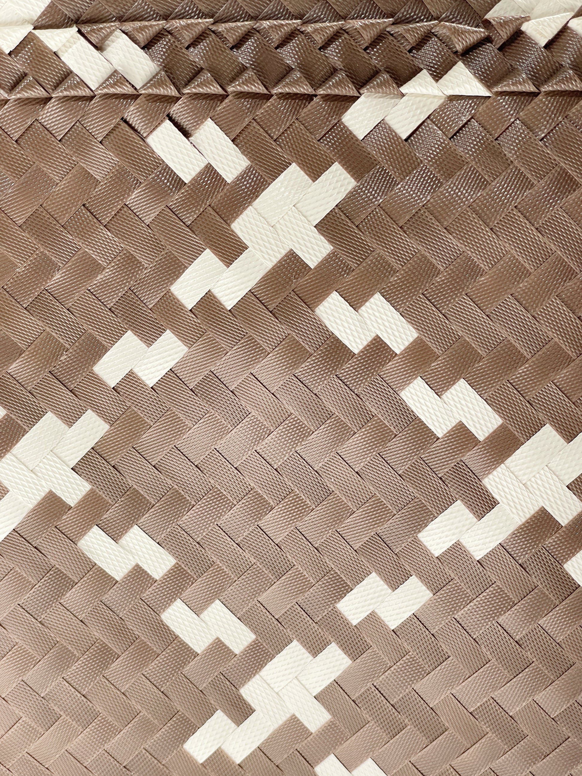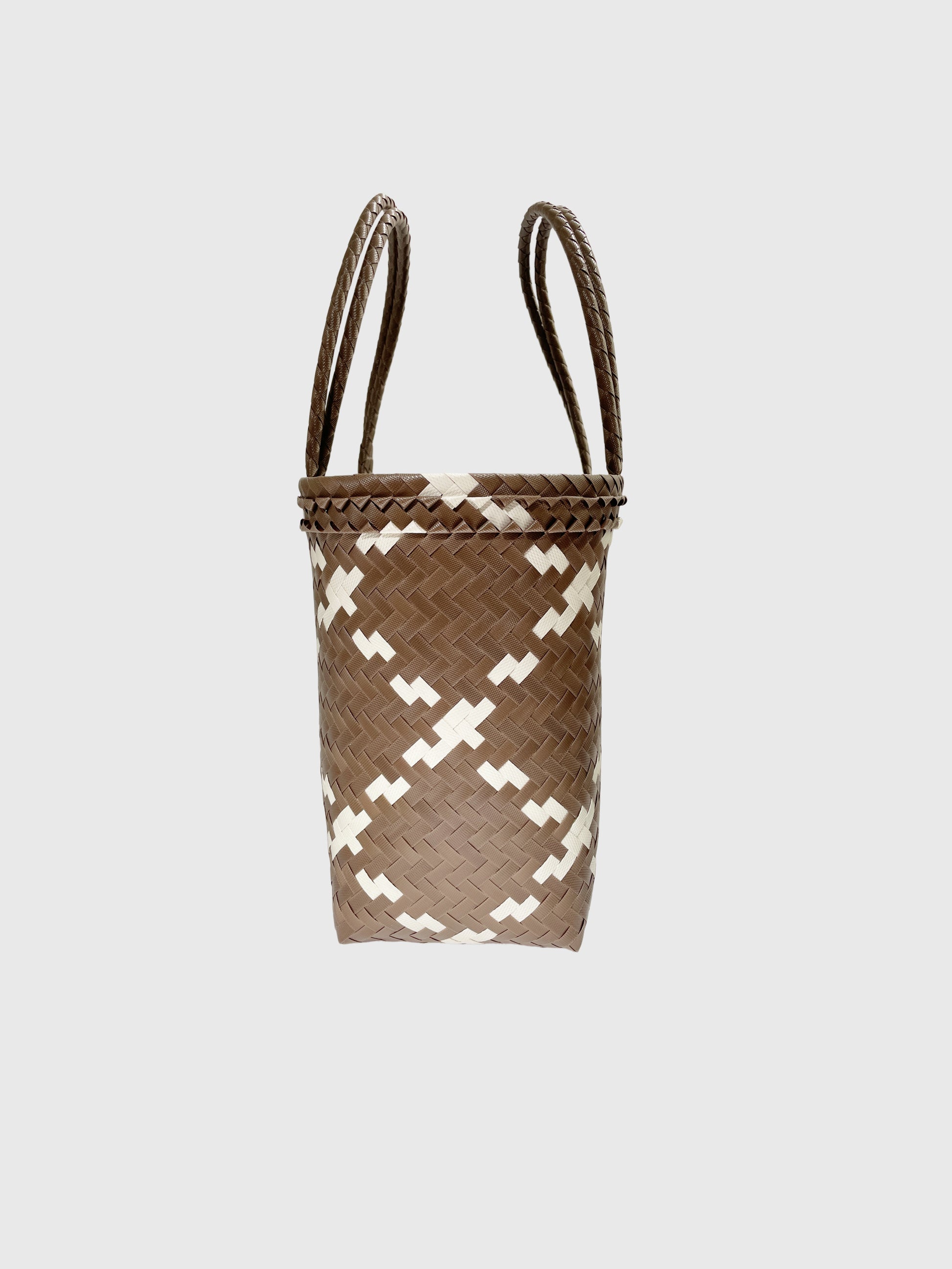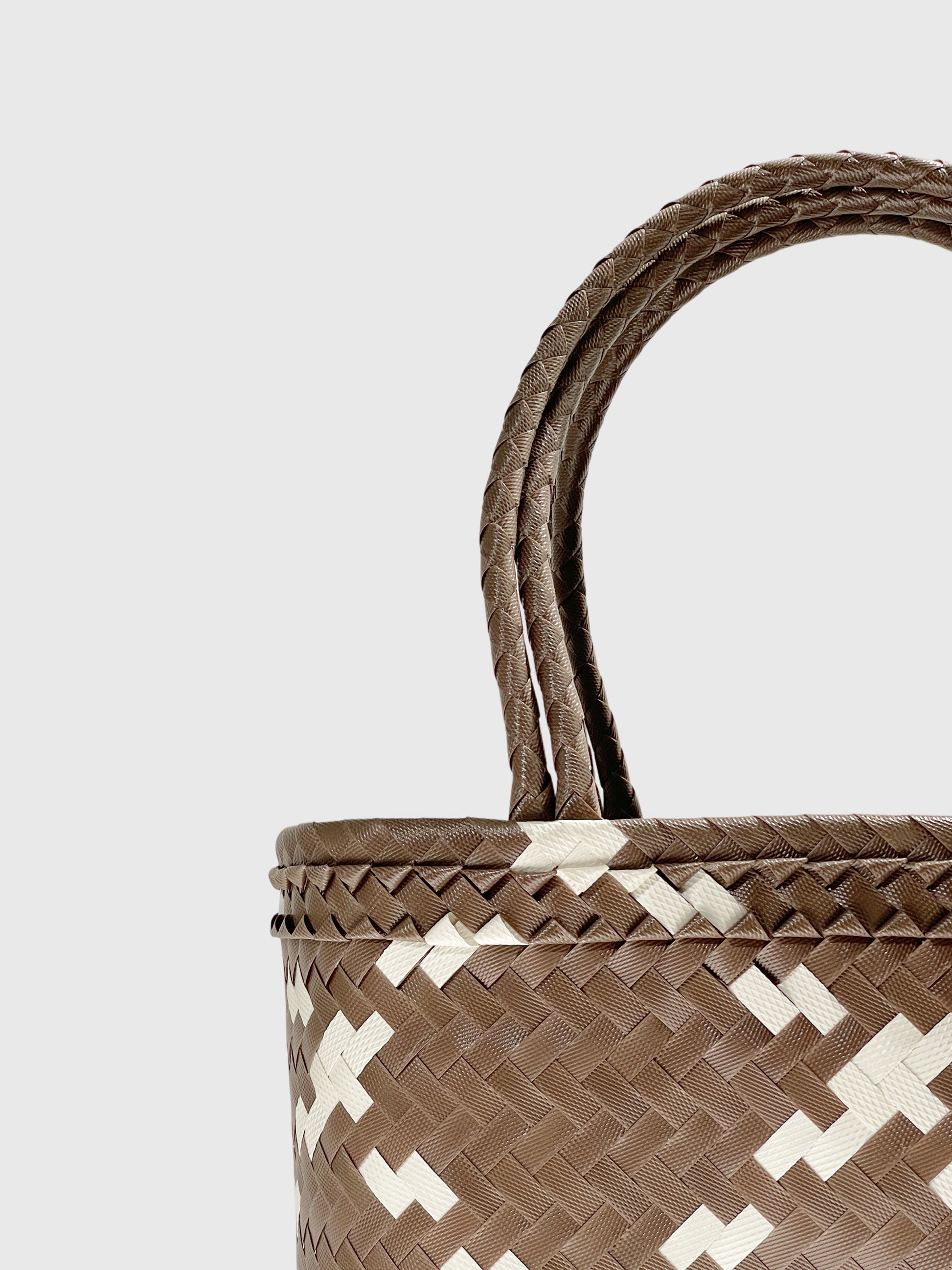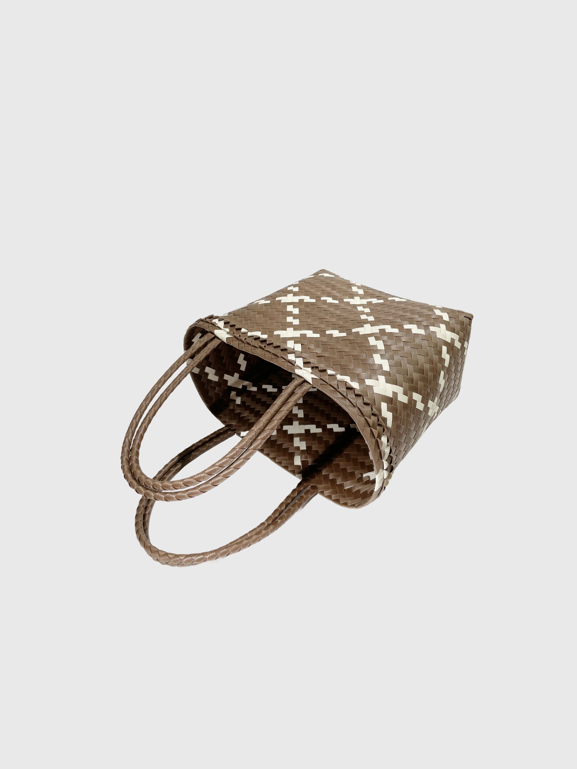 深みのあるチョコレートブラウンに、ミルクのようなやさしいホワイトで格子模様を施した上品なデザイン。シンプルながらも存在感があり、ナチュラルさとクラシックさを兼ね備えています。大人の女性のコーディネートに自然に馴染むカラーリングです。