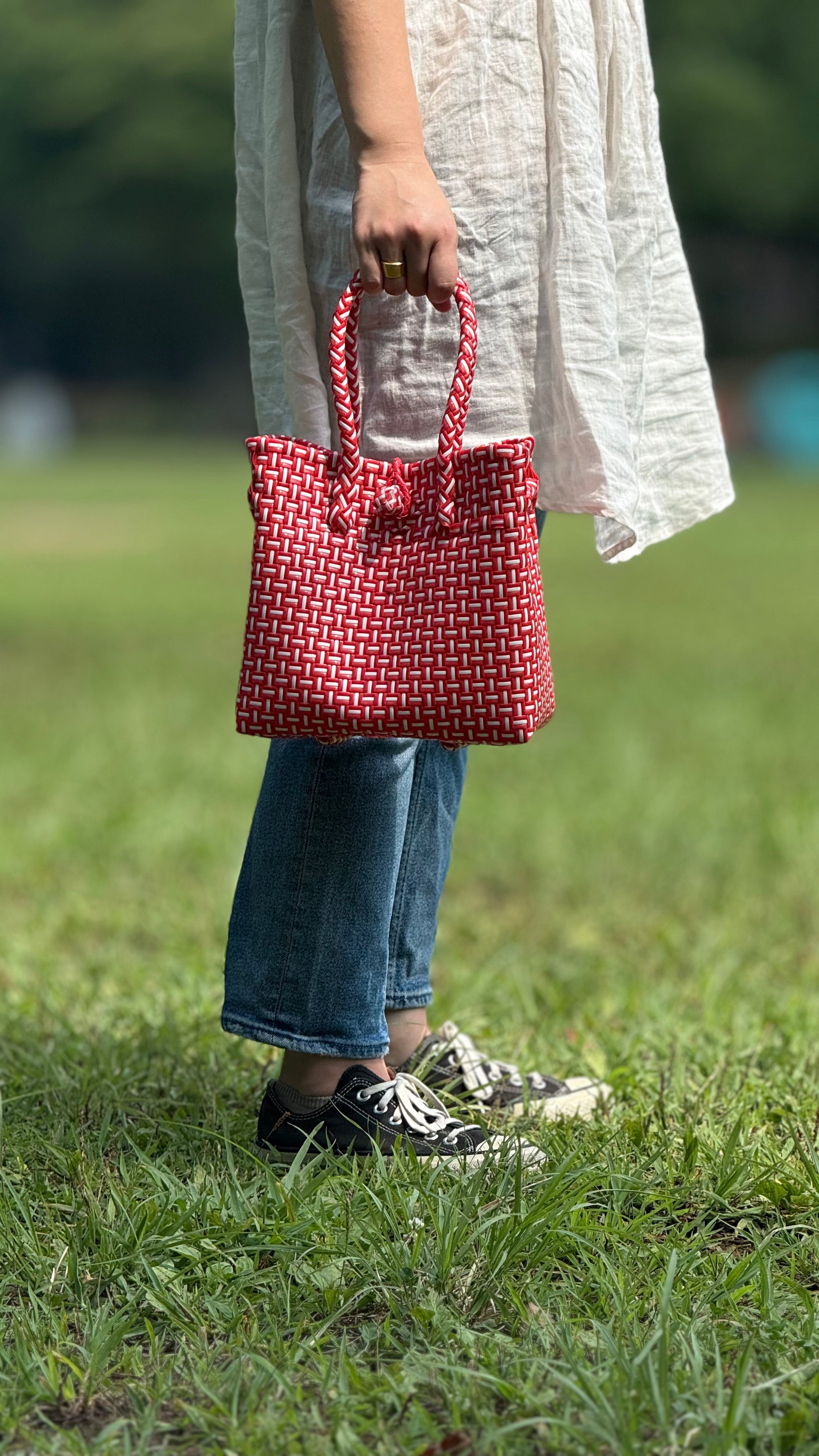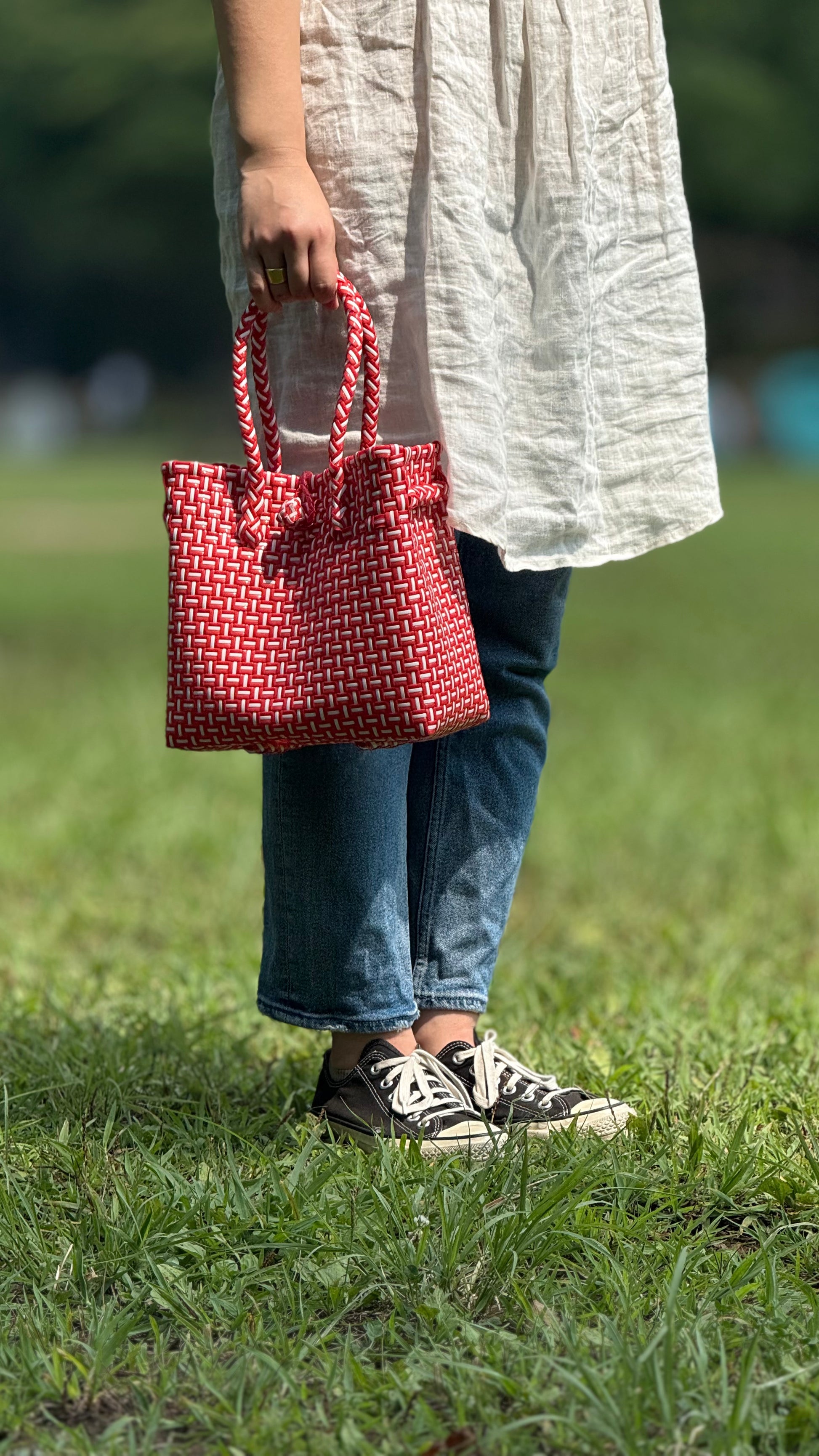 鮮やかなレッドとホワイトのコントラストが目を惹くデザイン。華やかさの中に上品さも感じられ、季節を問わずコーディネートのアクセントになるカラーです。持つだけで気分を明るくしてくれます。